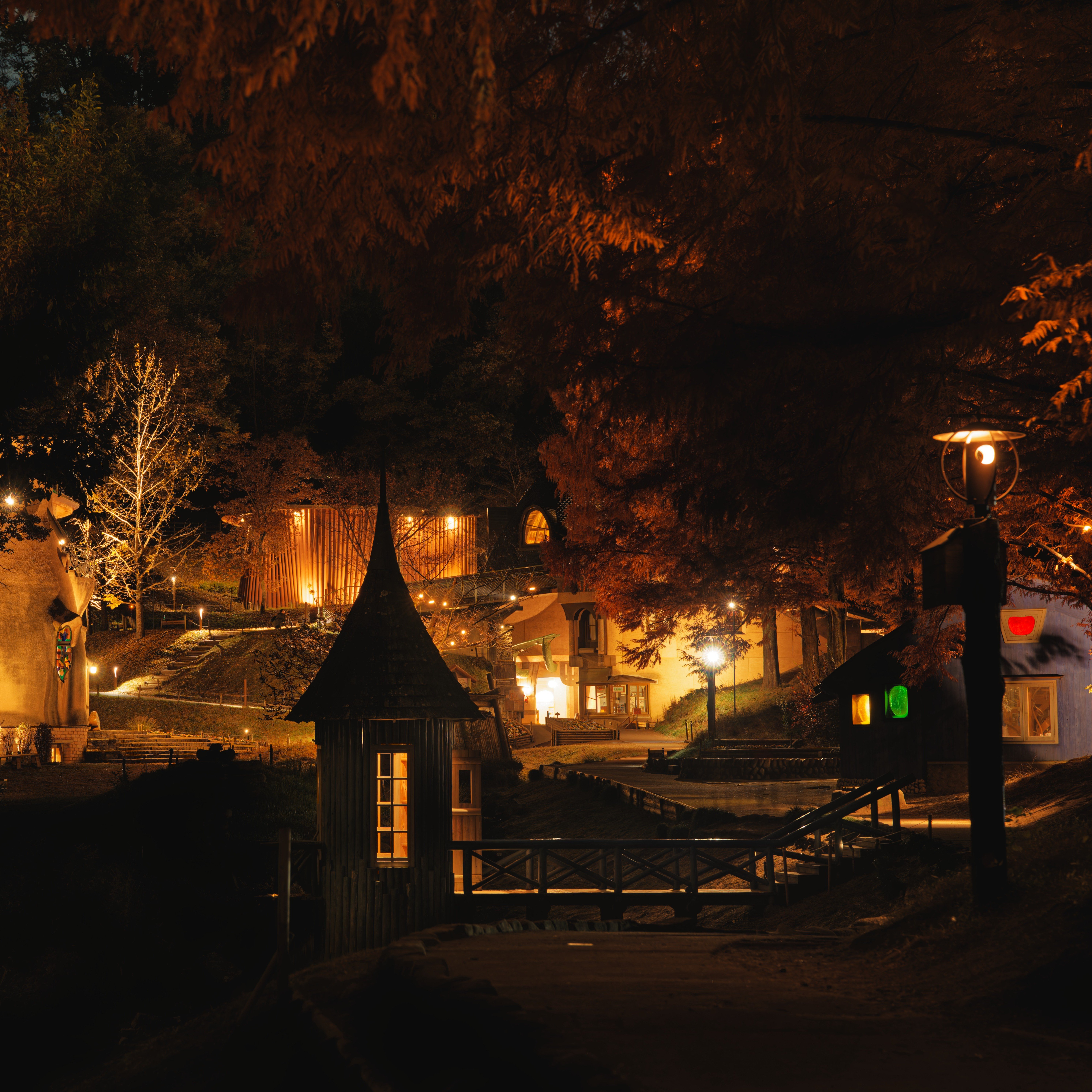 北欧の童話世界を思わせる建物が点在する自然豊かなロケーションで、森の中を散策しながら木漏れ日や季節の移ろいを感じられるのが魅力です。特に秋にはメタセコイアやイチョウが色づき、写真映えする景観が広がります。